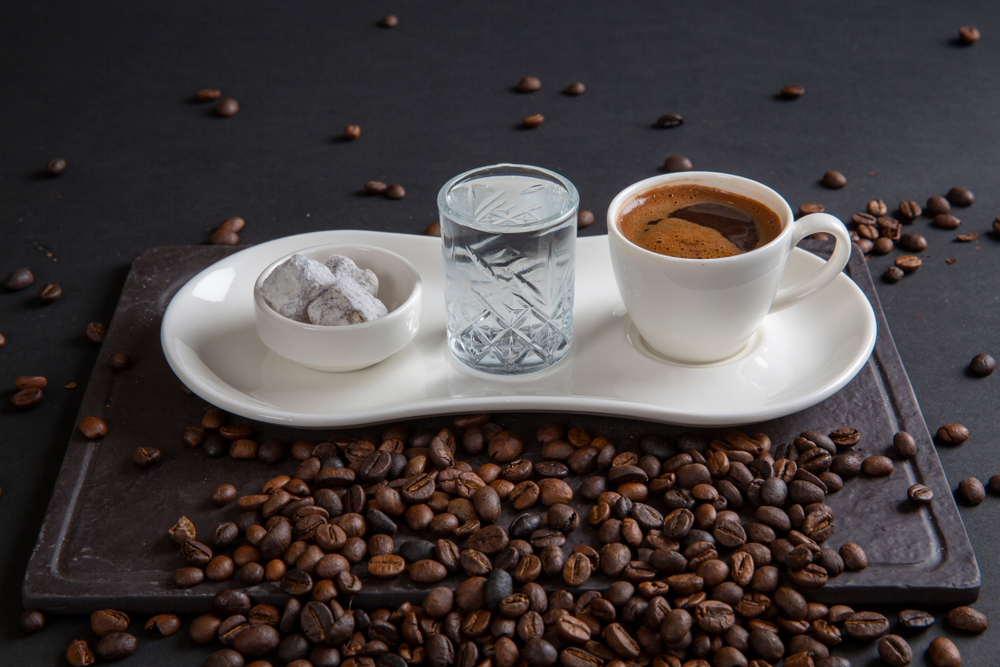 According to legend, if a guest drinks coffee, it means they're full and if they drink water, it means they're hungry. However, the real purpose is to drink water before coffee to cleanse the palate and fully experience the coffee's flavor.